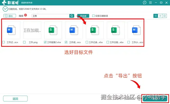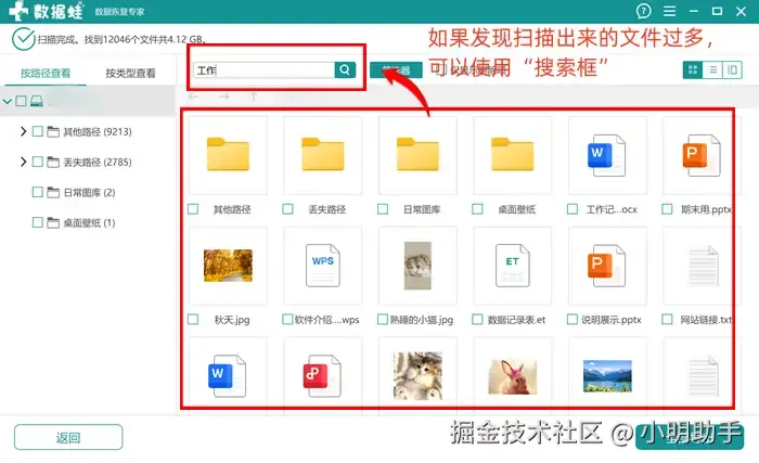 步骤2: 在软件扫描出来的文件中,勾选出自己需要导出恢复的文件;扫描文件太多的情况下,可以选择使用“搜索框”,在里面输入目标的文件名,点击旁边的放大镜,软件就能筛选文件,缩小查找范围了。