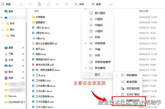 步骤1: 在U盘的存储空间页面中点击上方的“查看”,再指向“显示”;