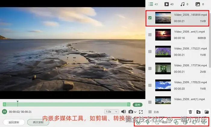 步骤3:当录制任务完成后,不用去借助其他外部工具,直接使用软件内置的录屏剪辑功能,就能对录制好的视频进行后期处理。比如快速对视频进行分段切割,加上特效啥的。