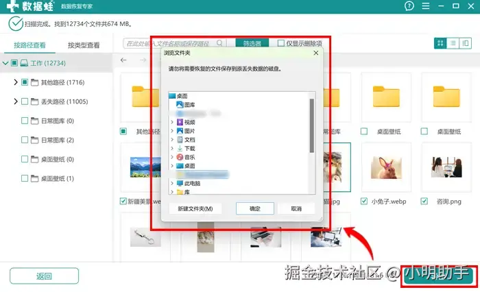 步骤3: 在“浏览文件夹”中选择恢复相片合适的存放位置。