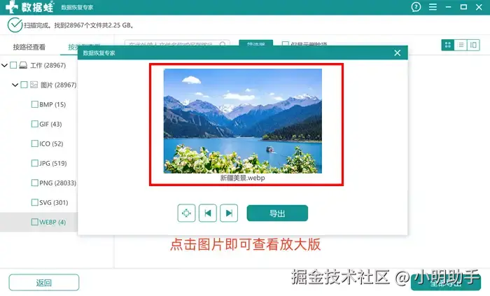 数据 蛙恢复专家拥有强大的文件扫描能力,我们可以使用它单选扫描“图片”文件,这样我们就能排除一堆其他类型的文件,在更小的范围中找到自己需要恢复的相片了。除此之外,这款软件还能够让扫描相片提前将内容预览,在进行恢复文件之前,我们就能精准选出目标相片进行导出,省时省力。