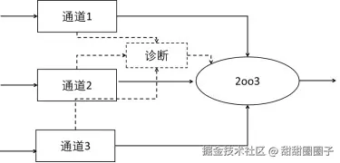 功能描述:该架构采用三个通道并行工作,按照少数服从多数原则,当至少两个通道一致时才进行输出。降级操作:当出现一次故障时,系统仍能降级到1oo2工作。