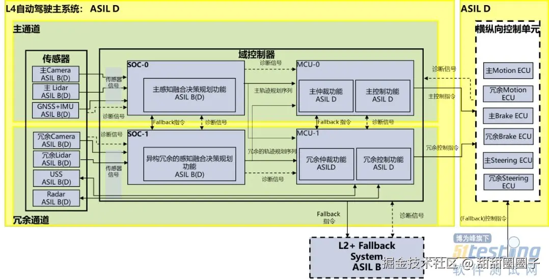 通信冗余: 在传感器、域控、执行器和其他相关控制器之间的通信通道和控制信号上需要具备冗余通道。这样,当单个通信通道发生故障时,系统能够通过冗余通道通信,或通过Fallback 系统进入最小风险状态。