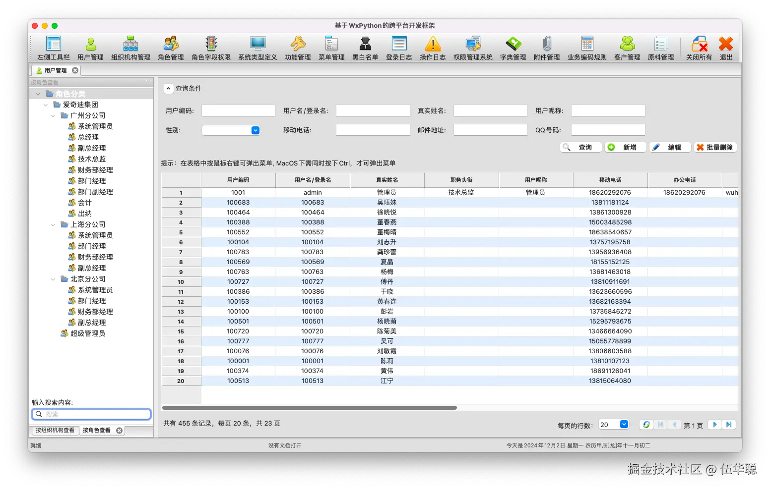 如对于用户列表界面的树列表界面,我们只需要在子类FrmUser中重写函数 create_tree_panels 即可,然后在通过构造函数创建两个自定义树列表控件即可,如下所示。