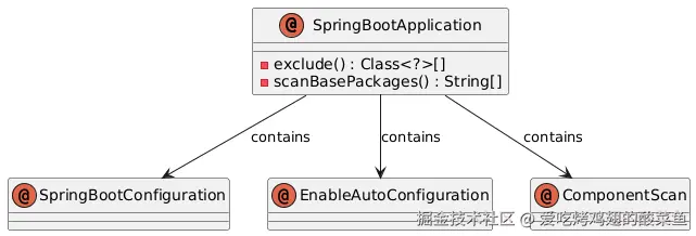 - @SpringBootConfiguration:本质是@Configuration注解的派生,标识启动类本身也是配置类。