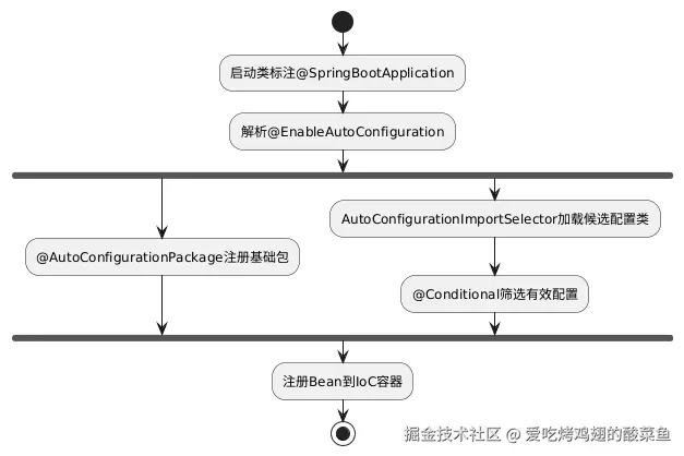 核心机制解析:通过@EnableAutoConfiguration串联三大关键动作—— @AutoConfigurationPackage划定基础包路径、AutoConfigurationImportSelector动态导入候选配置类、 @Conditional条件注解筛选有效配置,最终将依赖jar包中的配置类智能加载到Spring IoC容器。