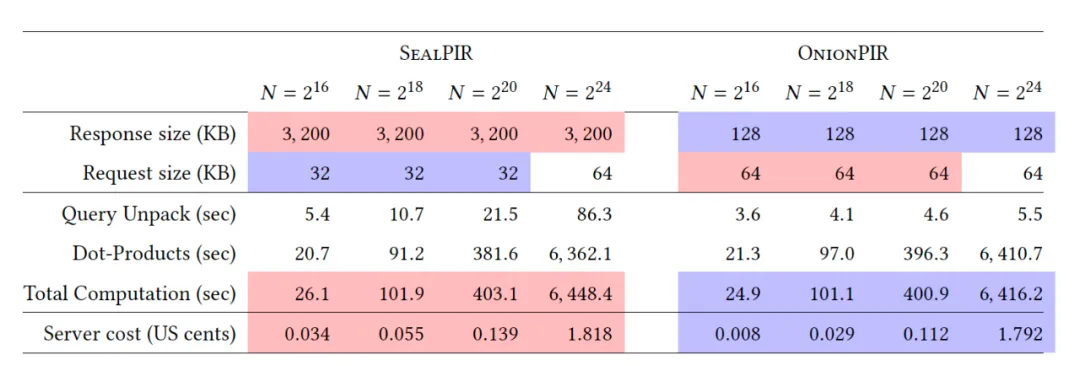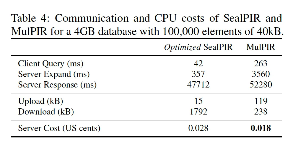[ALP+21]题目是《Communication–Computation Trade-offs in PIR》是计算量和通信量平衡的PIR方案,该方案显著降低了查询响应的通信量,从成本(monetary)的角度看比SealPIR降低了35%。