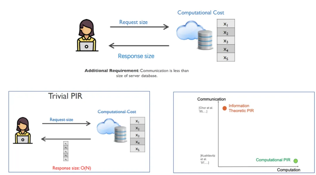 因此PIR的通信量要求小于数据库的容量。对比IT-PIR和CPIR的计算量和通信量可以看到,IT-PIR在计算量较少,但通信量较大;CPIR计算量较大,但通信量较小。