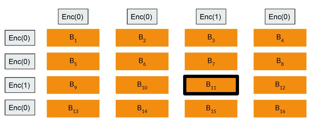 客户端使用公钥加密查询向量的每个分量,得到(𝐸(0),...,𝐸(0),𝐸(1),𝐸(0),...,𝐸(0)),发送给服务端;