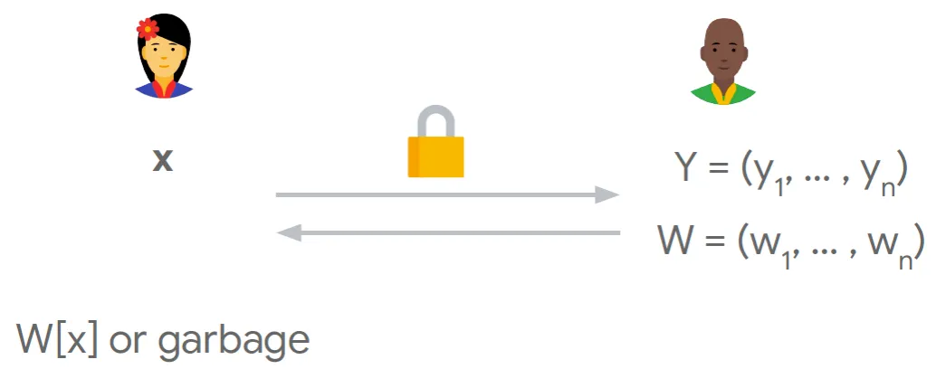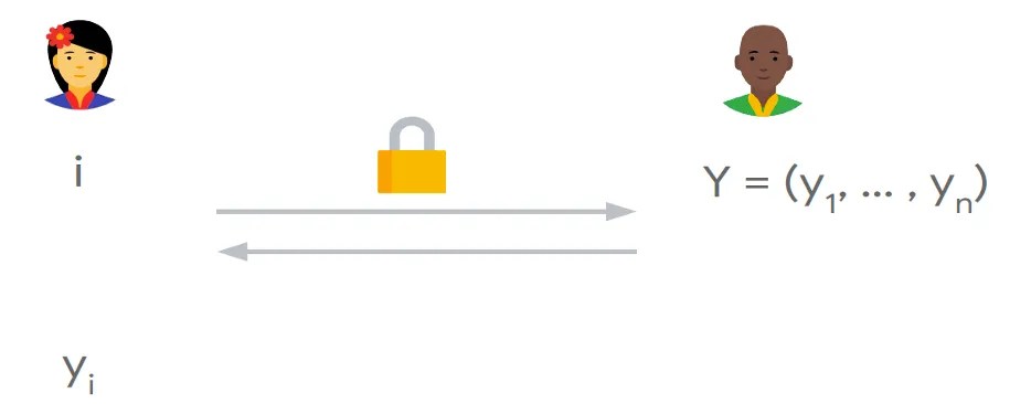 客户端生成查询𝑛维0-1向量(0,...,0,1,0,...,0),其中查询index 𝑖的位置位1,其它位置为0;