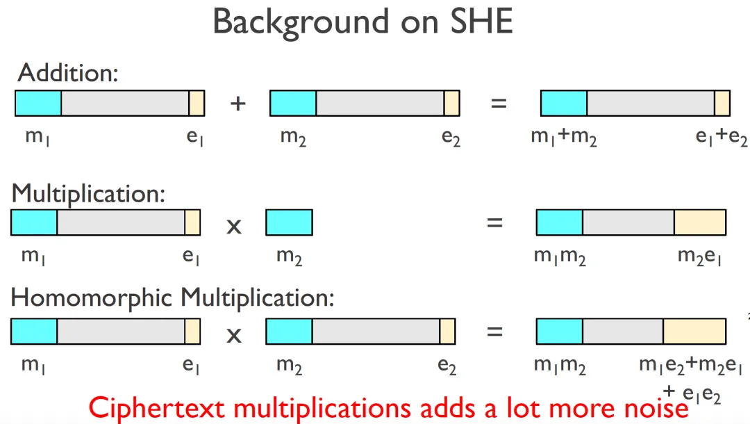 SHE的同态运算会引起噪声的增长,当噪声超过一定限制时,无法解密得到明文,所以要适当选择SHE算法的参数,及控制同态运算的噪声增长。