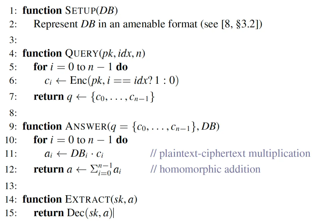 HE-based PIR协议可以抽象为四个子算法,即(Setup,Query,Answer,Extract)。