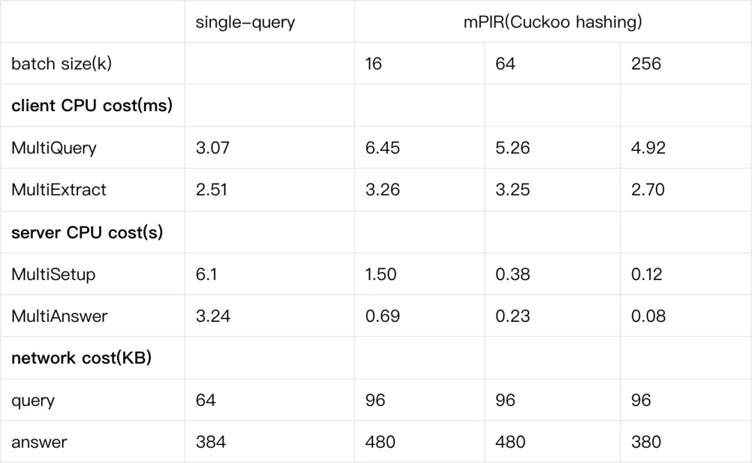 CuckooHash的hash数为3,bin数量为1.5𝑘,k为同时查询的数量。