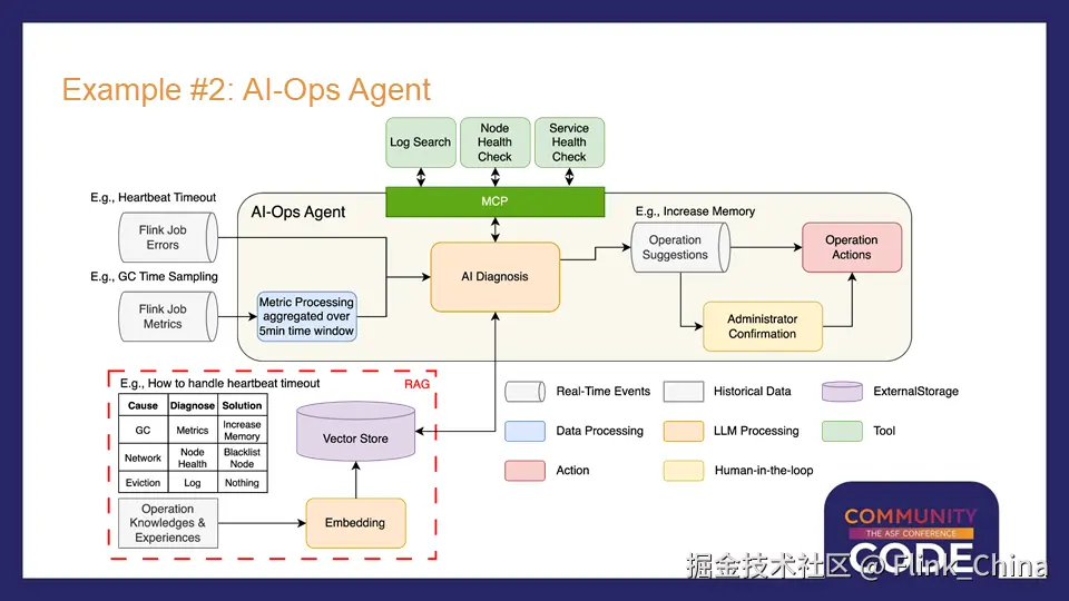 通过AI智能体的方式,系统可以在订阅运行指标和异常事件的基础上,将诊断过程交给AI处理。AI可以通过RAG技术查阅运维知识库,根据积累的经验选择合适的诊断手段,比如通过工具调用进行日志检索或节点健康检查。对于影响面较小的操作,AI可以直接执行;对于可能产生较大影响的操作,则通过人工确认后再执行。
