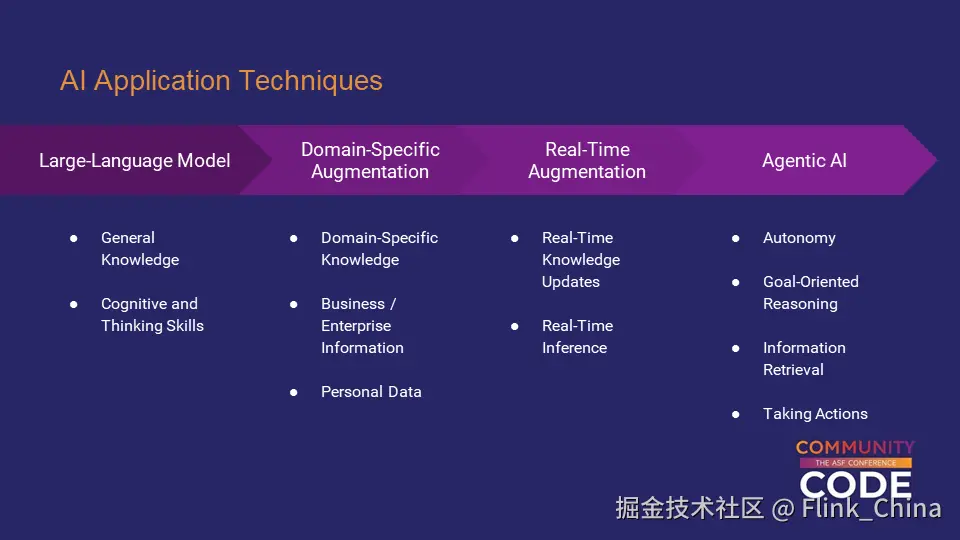 当前Flink 社区在AI的应用领域主要集中在第三和第四个层次,而Flink Agents项目正是专注于第四层——智能体AI的工程化实现。