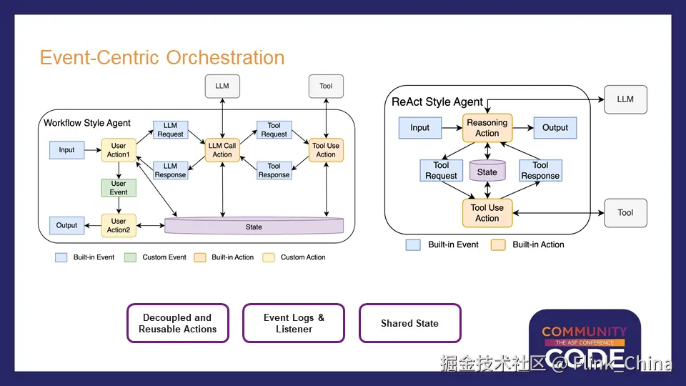 在智能体内部,Flink Agents采用了以事件为中心的编排方式。每个Agent由一系列Action组成,每个Action由特定的事件触发,同时在执行过程中也可以通过发出新的事件来触发其他Action的执行。