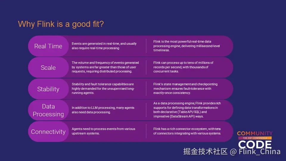 最后是连接能力,需要能够从不同系统中消费各种实时事件。这五个技术要求恰好与Apache Flink的核心能力高度吻合:毫秒级实时性、大规模分布式处理、状态管理和容错能力、丰富的数据处理功能,以及对主流存储系统的广泛支持。