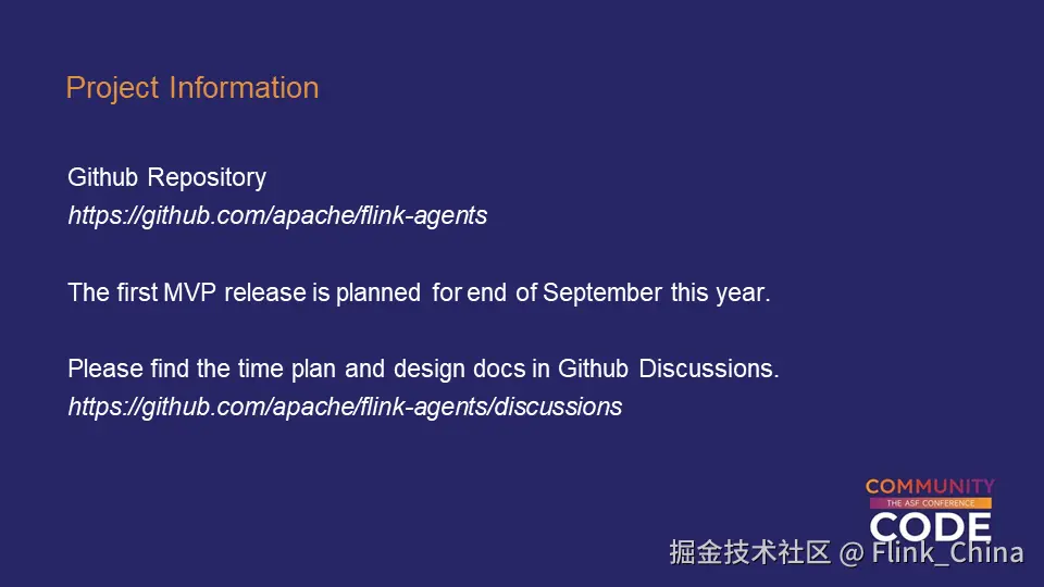 基于上述技术背景,Apache Flink社区在2025年发起了Flink Agents项目。这个项目非常年轻,5月份提出提案,6月份正式投票通过,到目前为止只有几个月的时间。有趣的是,这个项目是真正从零开始在社区中全新搭建的,而不是某个公司内部项目的开源版本。