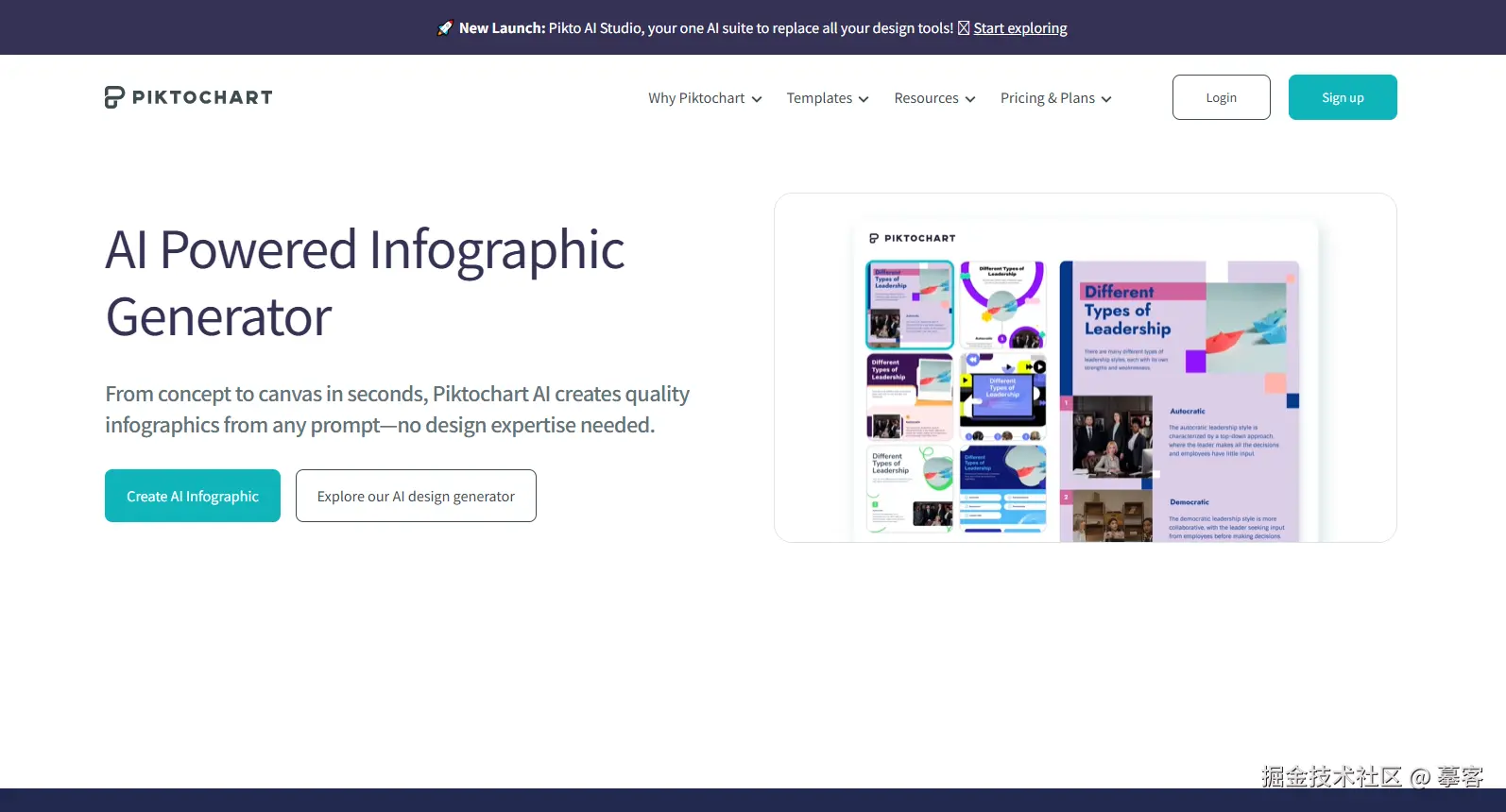 **推荐理由:**无论你是需要在客户会议上展示数据,还是为课堂教学准备视觉辅助,Piktochart AI 都能让你轻松产出令人印象深刻的图表。