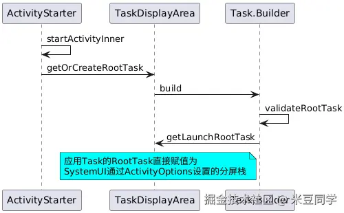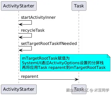 从上面流程可以看出不管启动Activity 流程中是复用栈还是新建栈,最后都是通过ActivityOptions.getLaunchRootTask获取了SystemUI 设置的分屏栈作为root task,这样就实现了应用启动在分屏栈中。