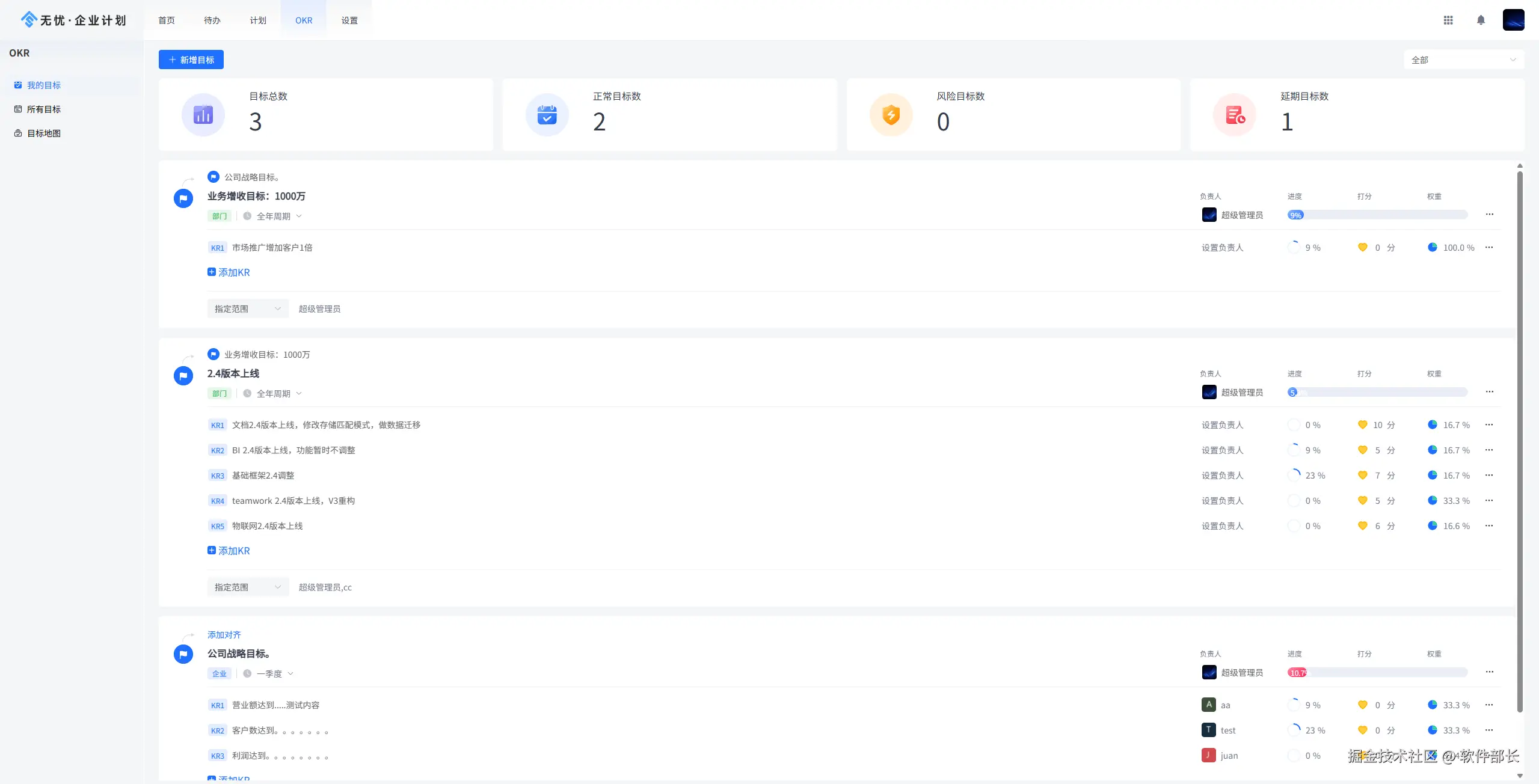 **✅ 无忧·企业计划:**企业级项目管理工具,将企业从经营目标到个人执行逐级分解监控执行。适合各类团队,包括产品、研发、设计、市场、运营、销售、HR等;主要用于项目管理、任务管理、进度跟踪、过程管理等场景。