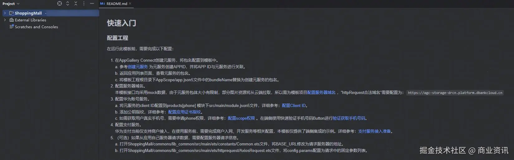 · 打开模板工程,根据README说明中的快速入门章节,将自己的应用信息配置在模板工程内,即可运行并查看模板效果。