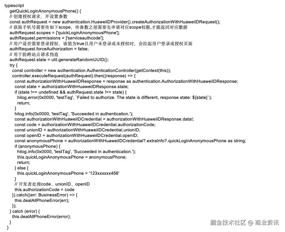 · 部分核心代码参见华为账号一键登录实现章节。