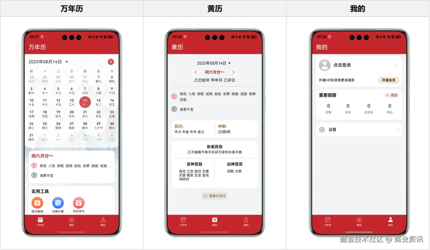 支持实用工具查询(吉日查询,日期计算,节日节气)。