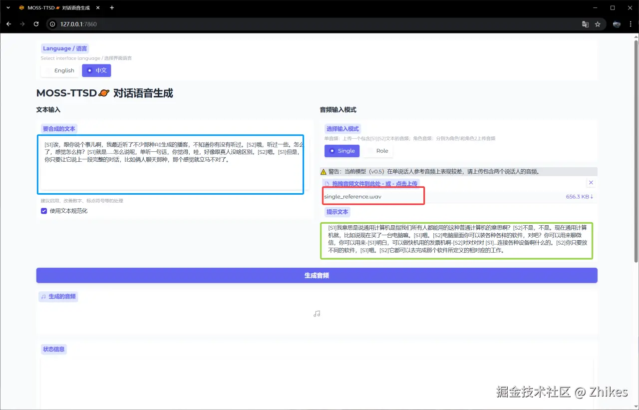 第一种是单音频方式,音频中包含两个说话人的音频,用[S1] [S2] 分别代表两个人的说话内容,填写到提示文本中。然后在要合成的文本中,也是使用这种方式,来进行文本To音频克隆的转换。