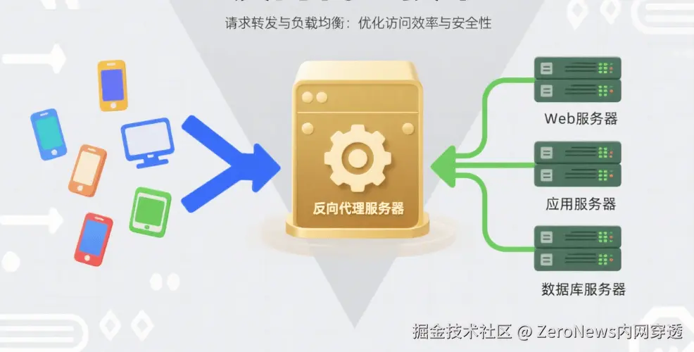 反向代理工作在网络应用层(HTTP/HTTPS)。它部署在企业网络边界,对外接收访问特定Web应用的请求,然后按规则转发给内网对应的服务器。它不会让远程设备整个接入内网,而是只开放一个特定的、受控的“应用窗口”。