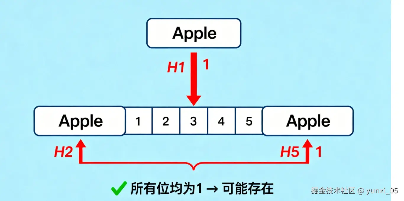 再次计算“Apple”的哈希位置,所有位置均为1,判断“可能存在”(实际存在)。 - 图4:查询不存在元素“Banana”