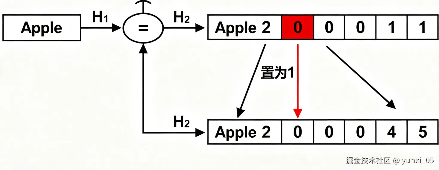 “Apple”经2个哈希函数计算后,对应数组的2个位置被置为1,完成元素映射。 - 图3:查询存在元素“Apple”