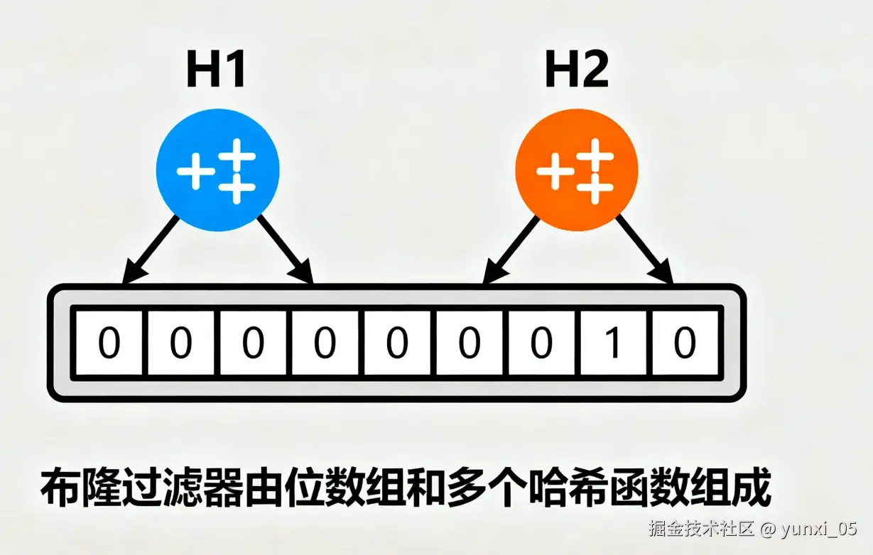 - 查询元素时:同样用所有哈希函数计算元素的索引位置,若所有位置的二进制值均为“1”,则判断元素“可能存在”;若任意一个位置为“0”,则判断元素“一定不存在”。