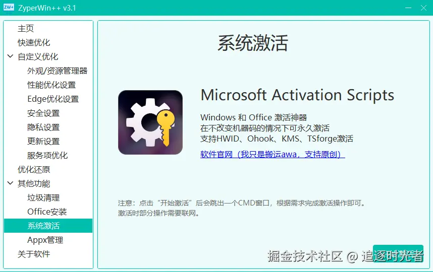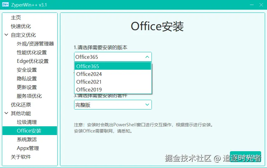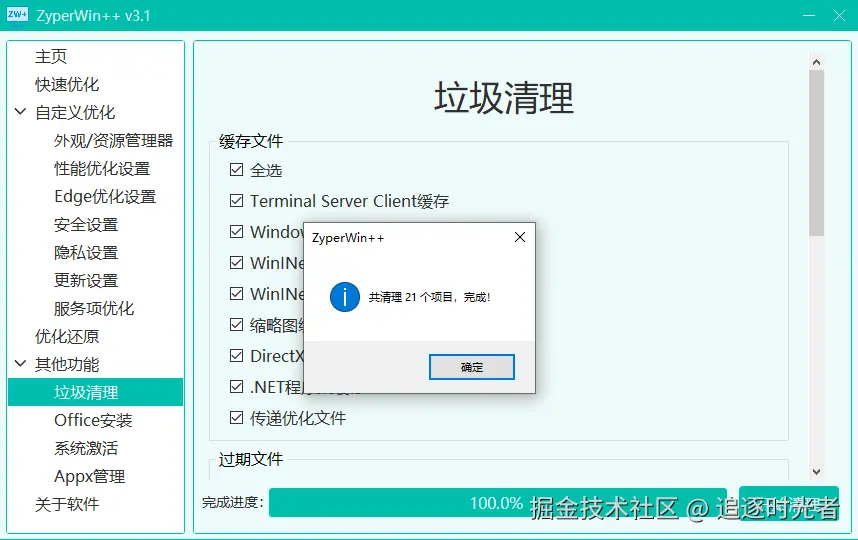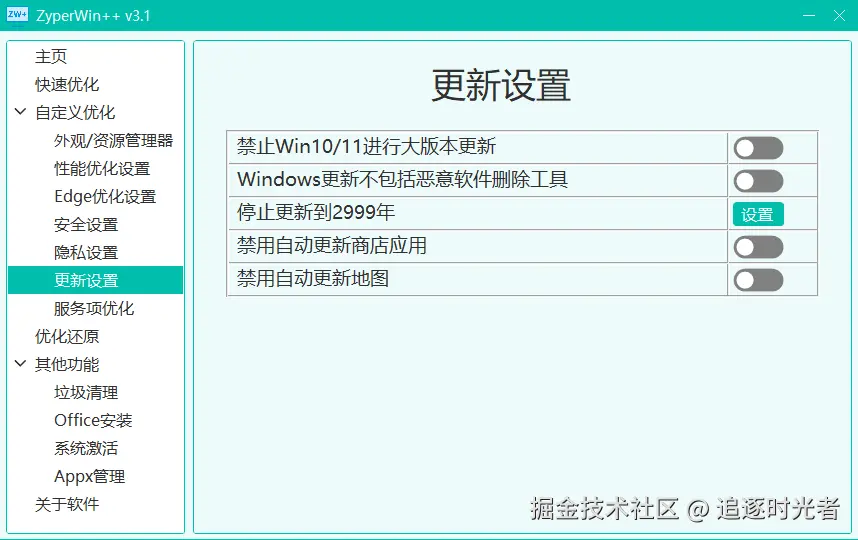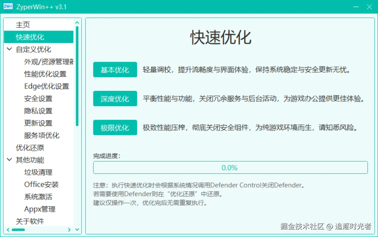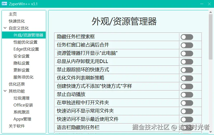 ZyperWin++ 是一个基于 .NET + SunnyUI 开源、轻便、简洁美观的 Windows 优化工具,适用于 Win7 - Win11 最新版的优化,包括性能优化、服务项优化、垃圾清理、资源管理器管理、安全设置、隐私设置、更新设置、Appx管理策略优化等操作,还支持系统激活和Office快速安装。