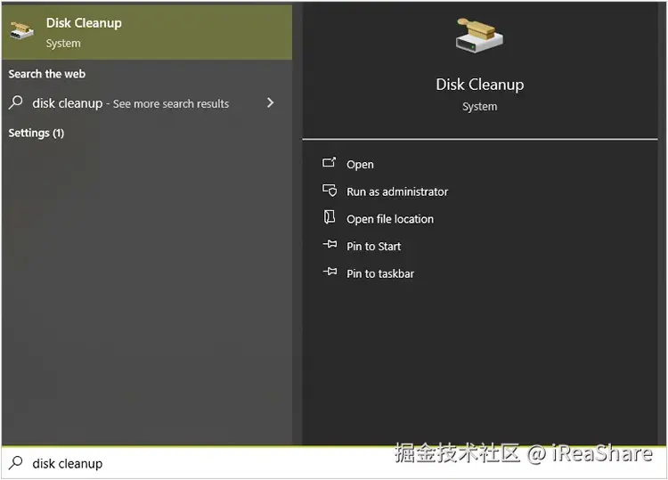 按 Windows 键,输入“磁盘清理”,然后在搜索结果中右键单击该应用程序。