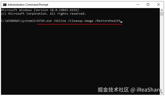 首先,运行 DISM 命令: DISM.exe /Online /Cleanup-image /Restorehealth 。等待其完成。