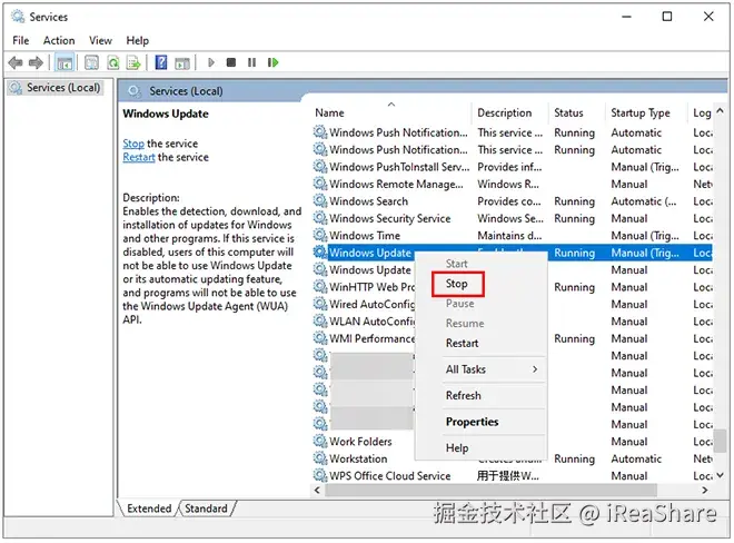 找到“ Windows 更新”,右键单击它,然后选择“停止”。