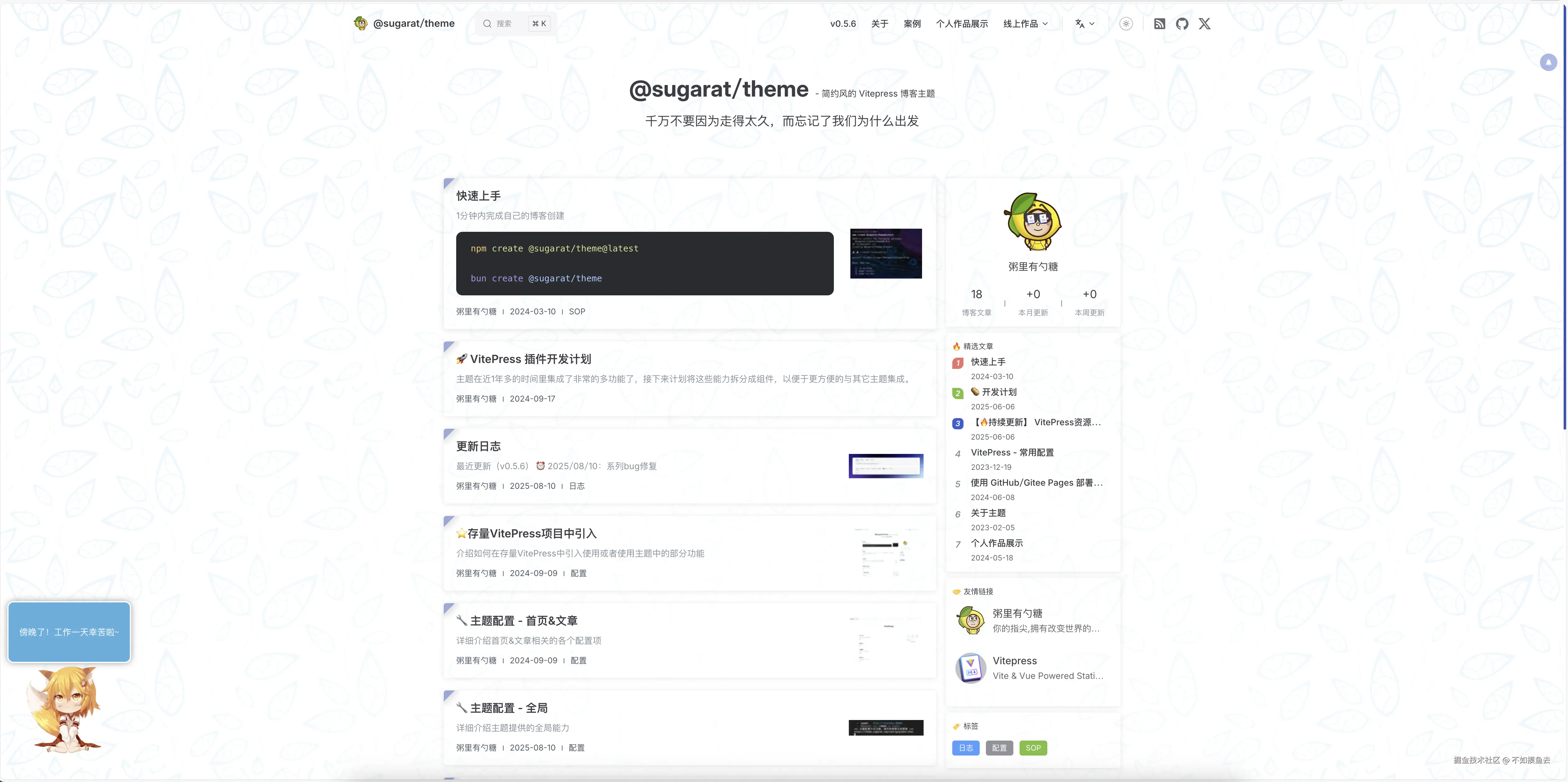 这次我选择了熟悉的 vitepress 来做博客的框架,主题就使用简约风的 Vitepress 博客主题 @sugarat/theme ,其文档见:theme.sugarat.top/