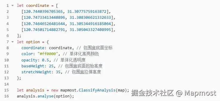在Mapmost SDK for WebGL中,可使用和倾斜模型同样的方式实现动态单体化。还是原来的接口,用户只需设置二维范围、底面起始高度以及在垂直方向上的拉伸高度即可完成包围盒的设置,添加单体化高亮颜色以及颜色透明度,即可实现3DGS模型的动态单体化。