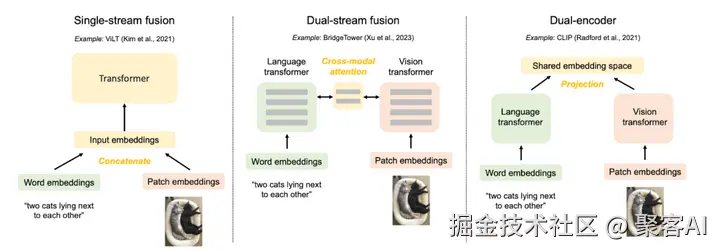 - 共享表征空间:将原始模态数据投影到统一向量空间。图像特征(如[像素1, 像素2, ...])和文本特征(如[词1, 词2, ...])被映射为数字向量(如[0.2, 0.8, ...]),确保相关内容(如图片猫和文字“猫”)在空间中邻近,无关内容远离。