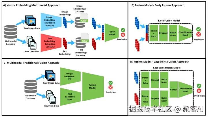 - 晚期融合(独立处理再结合):各模态独立处理,结果在决策层综合。例如,图像分析输出“这是一只猫”,文本分析输出“描述了宠物”,最终融合为“图片中的猫与文字一致”。优点是对噪声鲁棒,但可能忽略模态间深层关联。应用案例:医疗诊断中,影像AI和文本AI独立分析后综合;金融风控中,图像识别与文本分析并行评估风险;内容审核中,视觉和文本审核独立判定合规性。