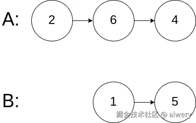 解释: 从各自的表头开始算起,链表 A 为 [2,6,4],链表 B 为 [1,5]。
