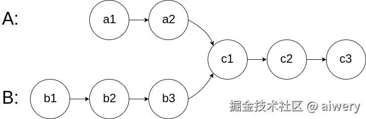 在 A 中,相交节点前有 2 个节点;在 B 中,相交节点前有 3 个节点。
