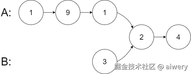 从各自的表头开始算起,链表 A 为 [1,9,1,2,4],链表 B 为 [3,2,4]。