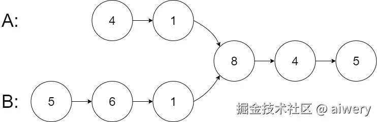 从各自的表头开始算起,链表 A 为 [4,1,8,4,5],链表 B 为 [5,6,1,8,4,5]。