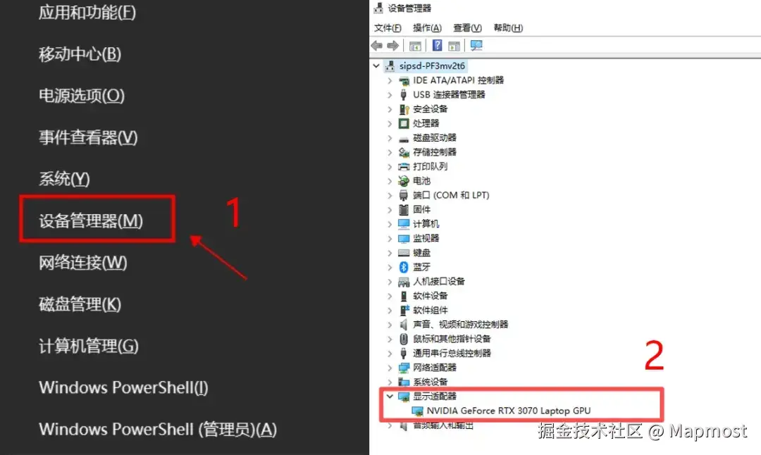 很简单,按Win + X键,选择“设备管理器”,找到**“显示适配器”**并展开,就能看到本机的显卡信息了。下图显示"NVIDIA GeForce RTX 3070 Laptop GPU",即为独显。