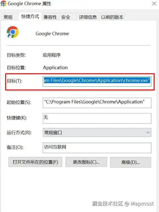 2、右击桌面的Chrome快捷方式,在“目标”中复制完整路径;
