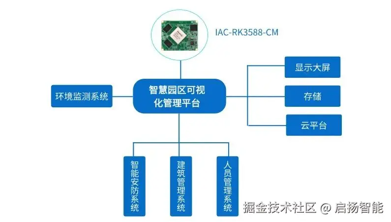 可视化智慧园区管理平台的实现在于可视化的数据分析处理以及多平台数字资源的融合,这就要求主控平台硬件具备更高算力、更大存储、更多扩展性、更强稳定性。可采用启扬RK3588硬件,基于4*Cortex-A76+4*Cortex-A55八核处理器,可高效处理来自园区各种传感器和监控设备收集的数据,保障平台在高负载的情况下流畅运行。