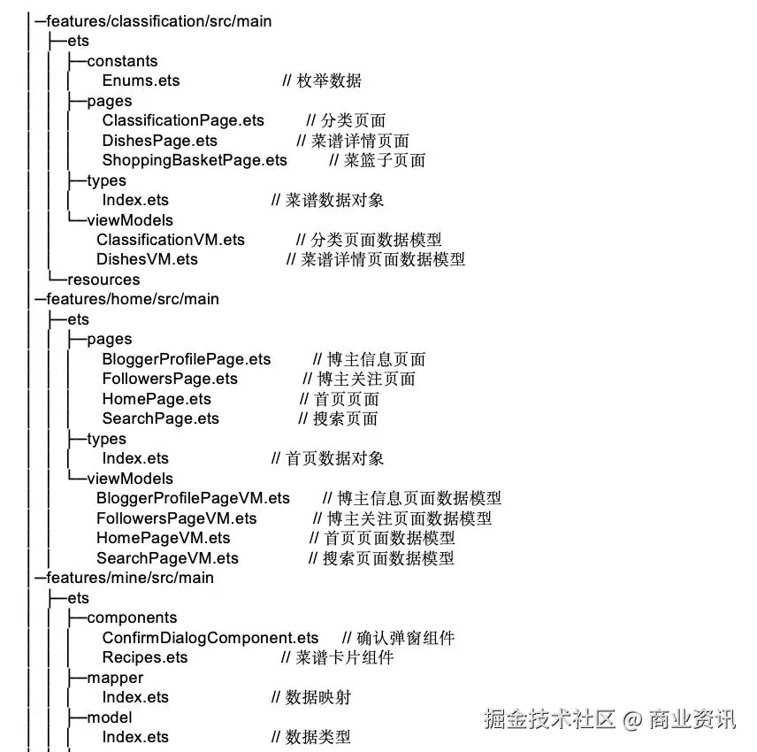 本实践的基础特性层将应用底部导航栏的每个选项拆分成一个独立的业务功能模块,包含首页、分类、热量计算和我的。