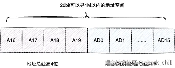 同时8086是16位的cpu,即数据总线也有16位,这意味着它一次性可以读取16bit的数据。因为数据总线和地址总线共享针脚,所以总线的名称为AD0~AD15。同时地址还有A16~A19这高4位,所以地址总线实际是有20位,换算一下: